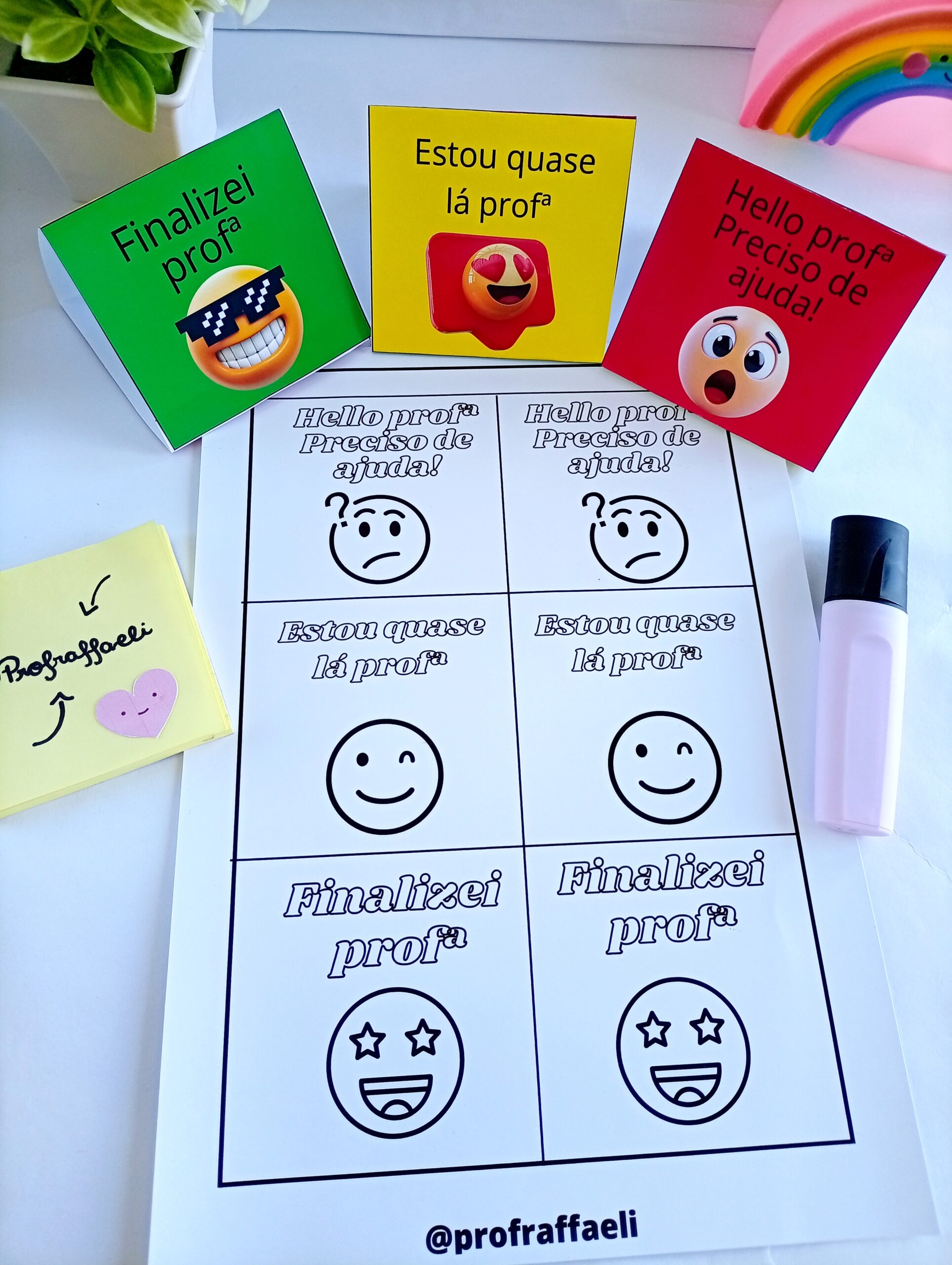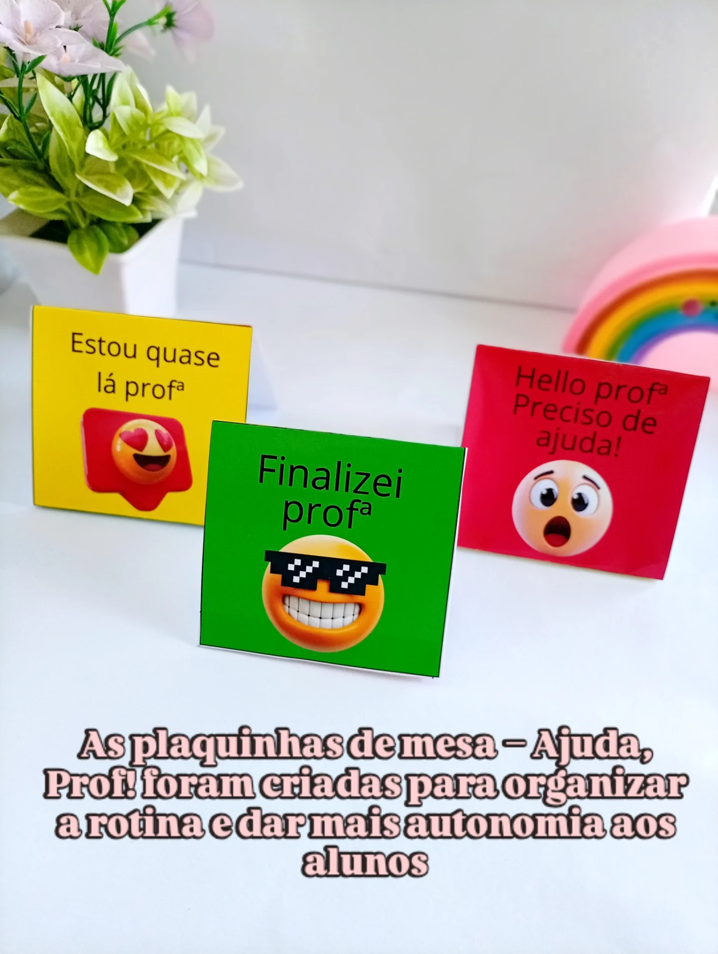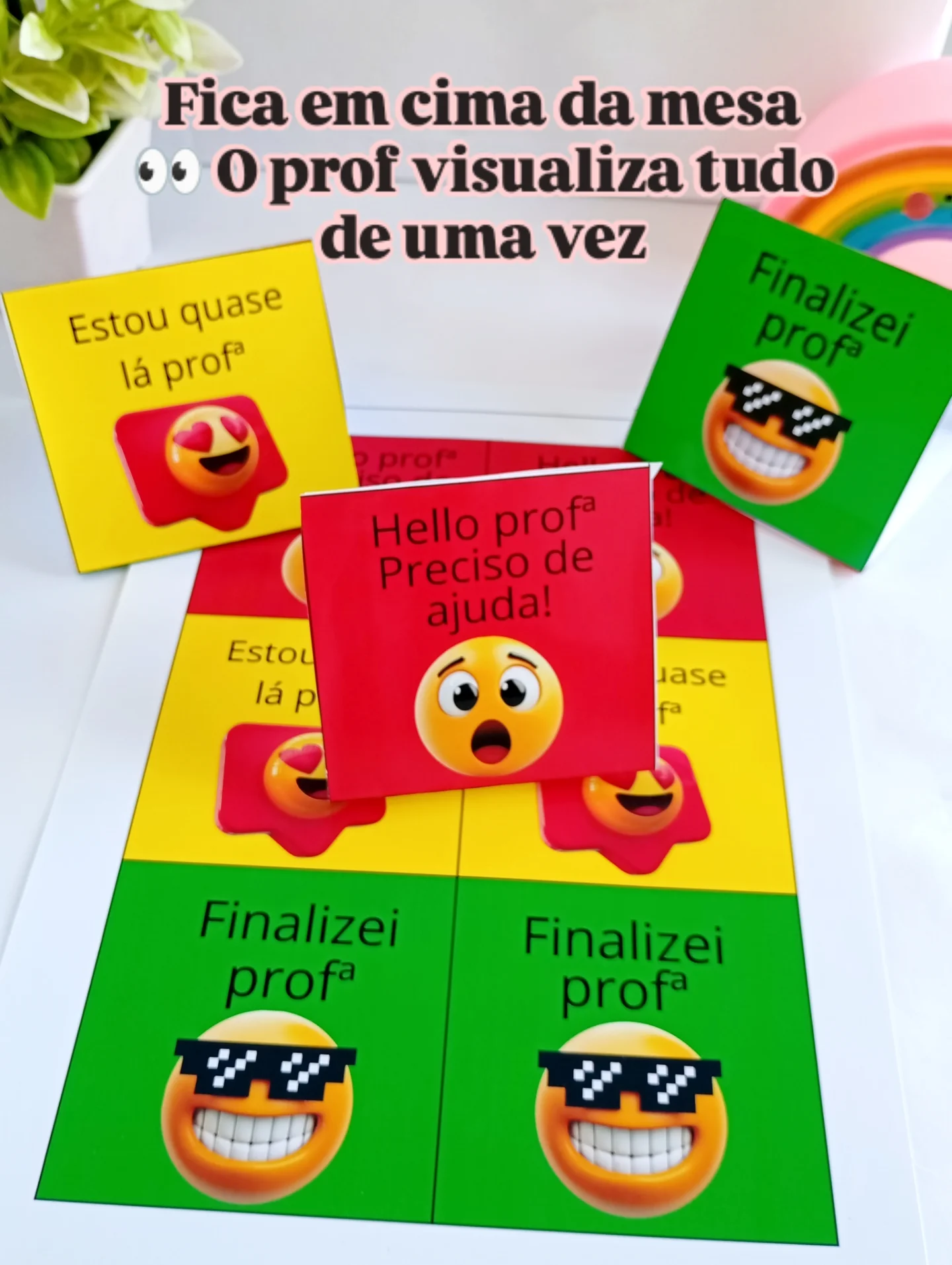 A Plaquinha de Mesa – Ajuda, Prof! fica em cima da mesa do aluno e pode ser virada conforme a necessidade, permitindo que o professor visualize rapidamente toda a turma e organize o atendimento com mais estratégia.