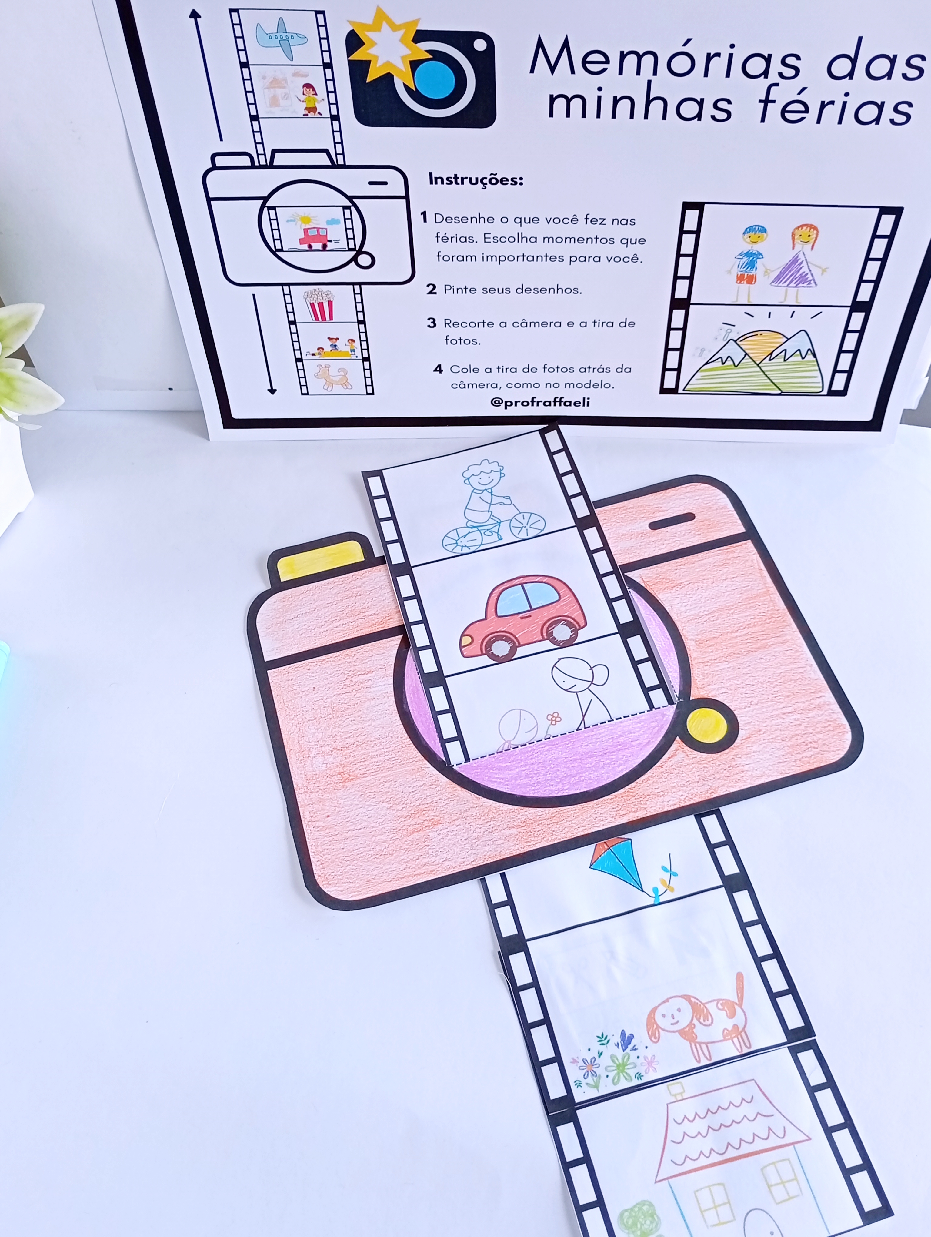Nesta atividade, a criança desenha, pinta, recorta e monta suas próprias lembranças, enquanto o professor observa o desenvolvimento da linguagem, a organização de ideias, a coordenação motora e a construção de vínculos — tudo de forma natural e significativa.